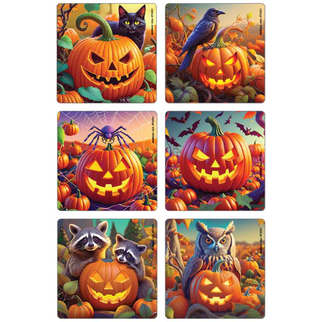 Looking for Halloween stickers that are fun and spooky, but not too scary? Classic pumpkin faces and whimsical Autumn critters make these stickers just right for kids of all ages. Jack-O’-Lanterns are a timeless Halloween tradition! The richly colored designs will put anyone in a Halloween mood.